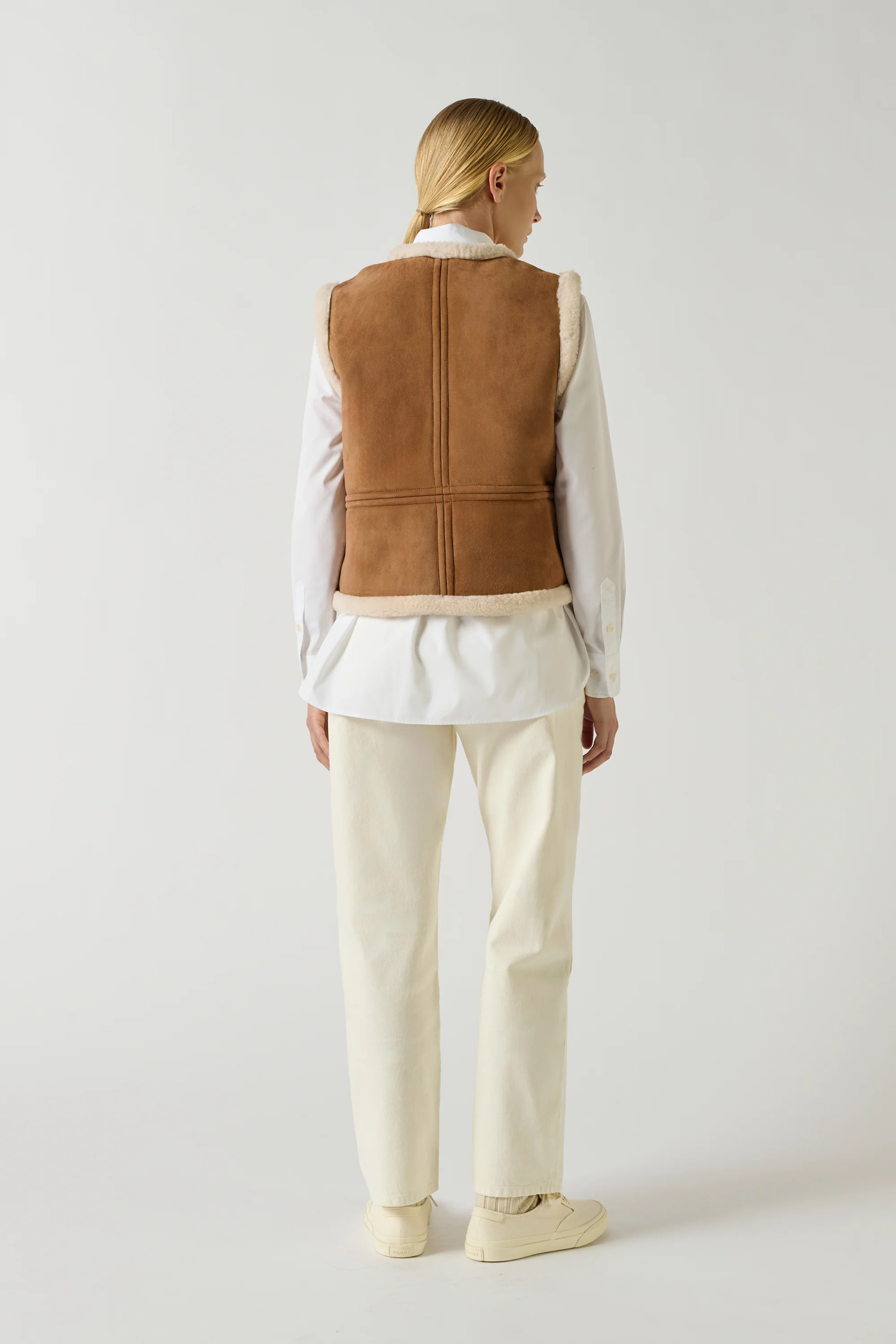 PYRENNES is a sleeveless gilet made of natural sheepskin. Its straight cut is designed like an asymmetrical wrap-around, with a buttoned opening and hidden pockets at the waist seam. The lambswool is particularly warm.