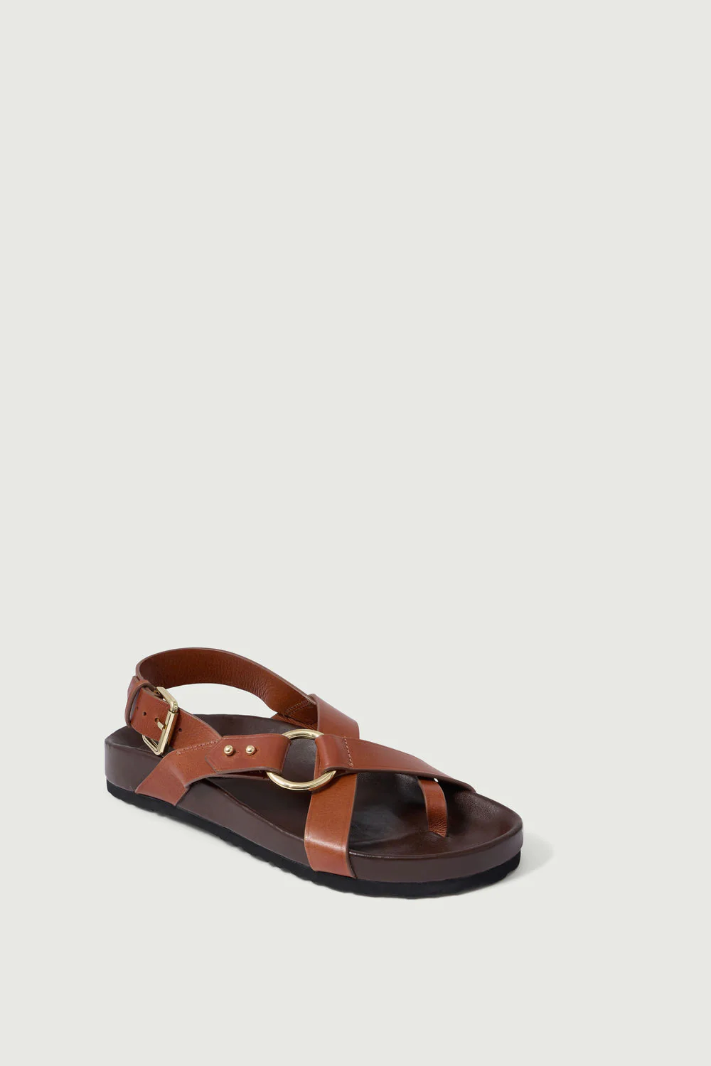 MEXICO is a pair of leather sandals. The crossed straps dress the front of the foot and wrap around the big toe. The thick sole (cork covered with leather) provides all-day comfort and support. The gold ring signature makes this an iconic sandal, reinterpreted each season in exclusive new colours.