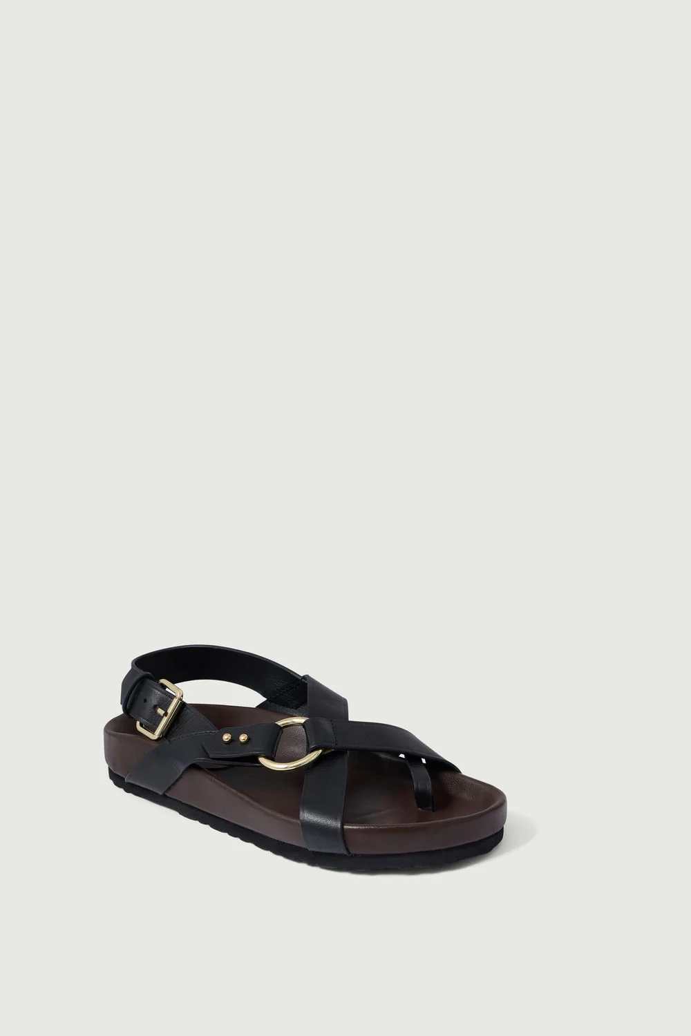 MEXICO is a pair of leather sandals. The crossed straps dress the front of the foot and wrap around the big toe. The thick sole (cork covered with leather) provides all-day comfort and support. The gold ring signature makes this an iconic sandal, reinterpreted each season in exclusive new colours.